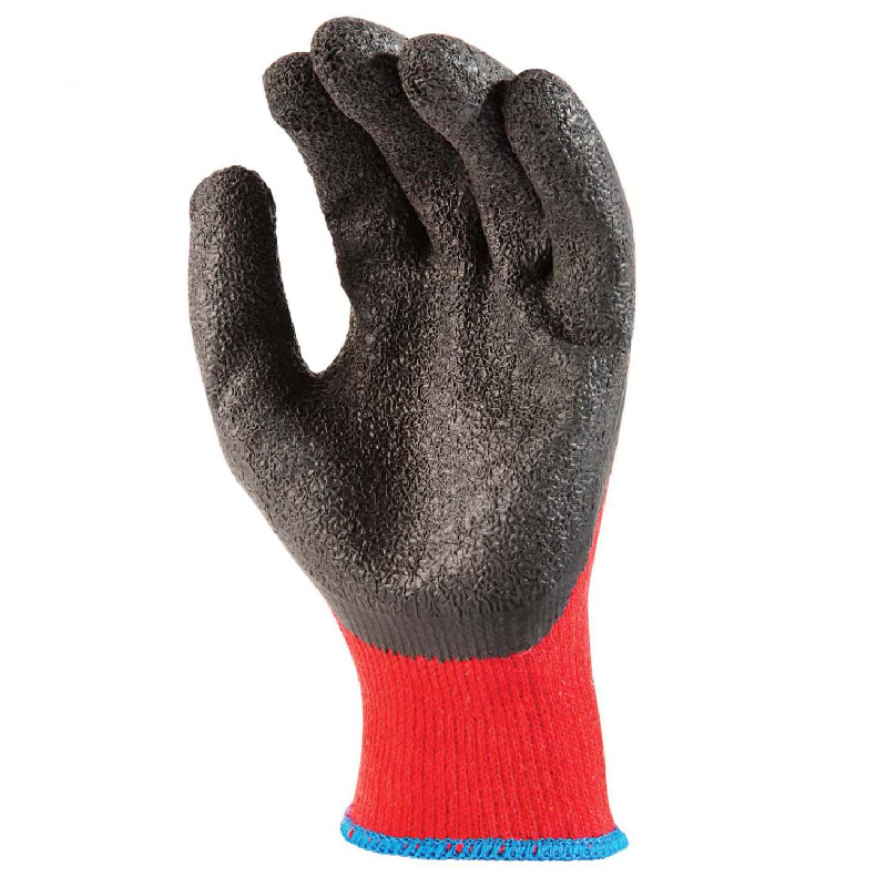 Black latex crinkle palm coated glove onto 10 gg machine knitted(crochet) red cotton liner. Excellent grip and dexterity makes this glove ideal for use when secure grip is important