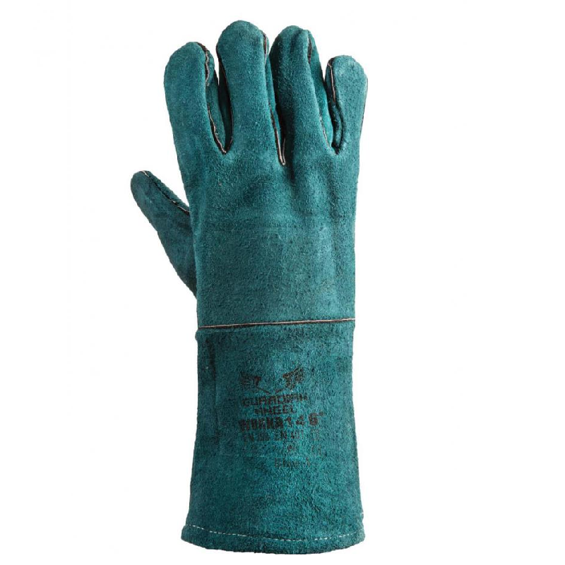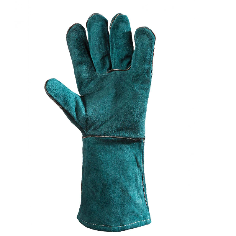 Green dyed cow split leather lined welders glove. Gunn cut, wing thumb fully cotton lined, sewn with syntax thread, welted hand & material bound cuff. This glove is designed for the use with welding related operations.