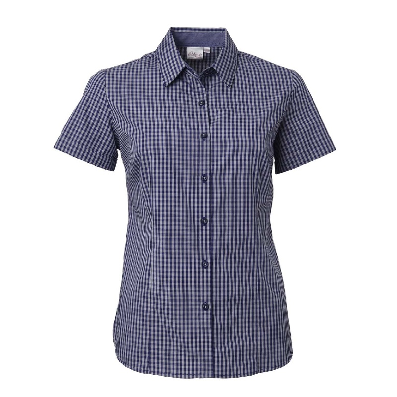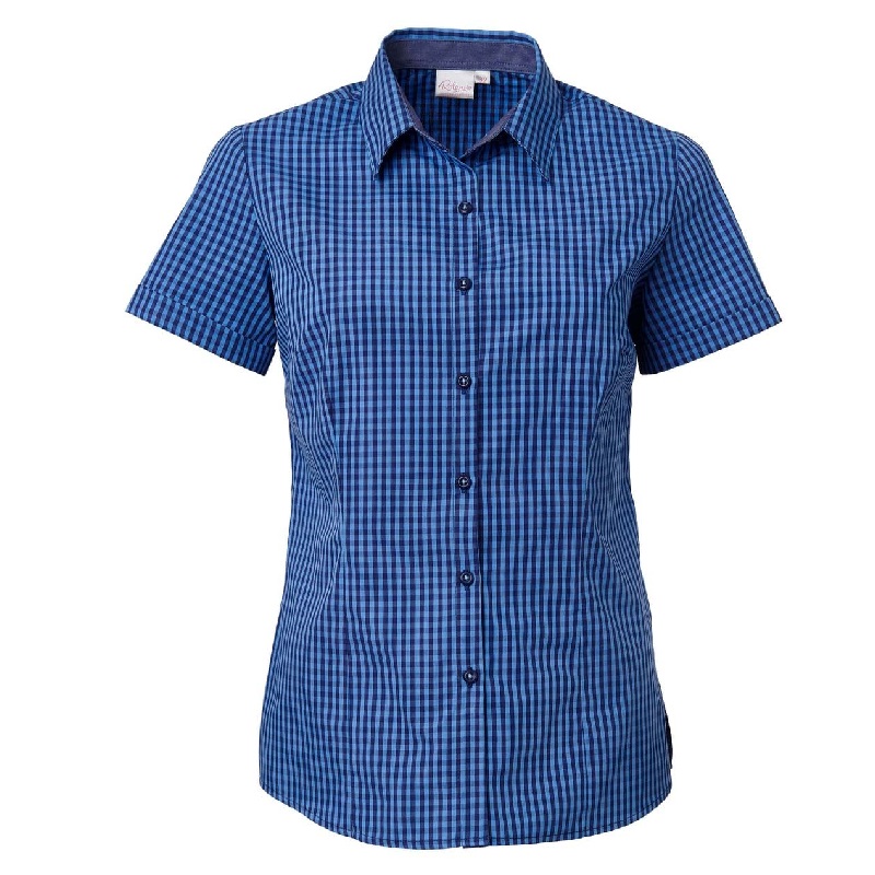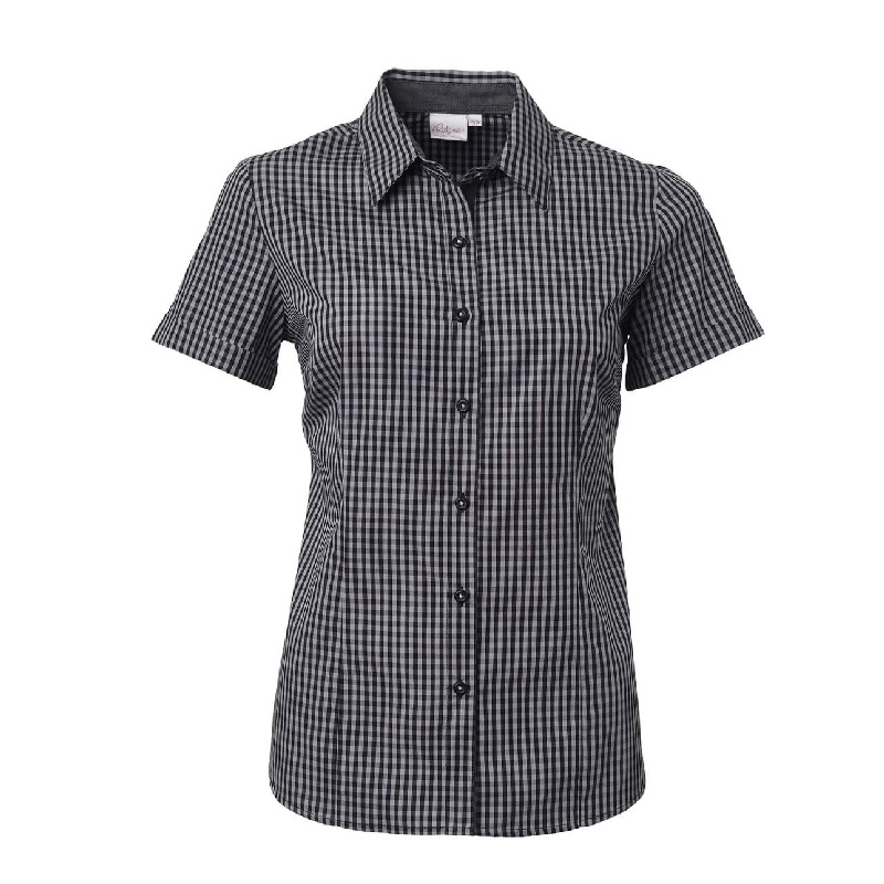Amber S/S Blouse: Semi-fitted, with front and back darts, and side vents. Turn-back sleeve hems. Edgy contrast trim on placket and collar stand
